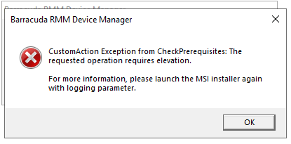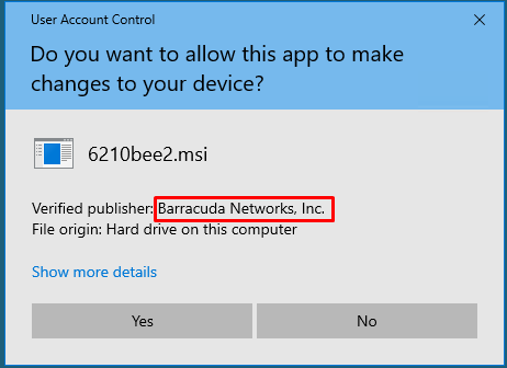 Double click DMInstaller to begin the installation, you may be prompted with a User Account Control (UAC) to ask if you wish to proceed. You will notice that the verified publisher is Barracuda Networks, Inc. this is the vendor of the RMM in use, Barracuda RMM